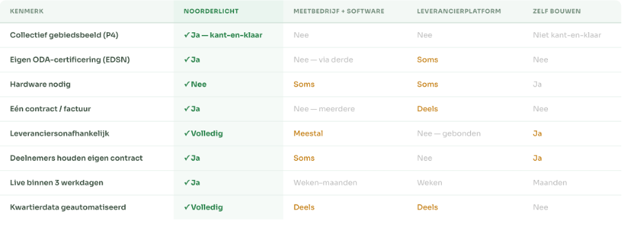 Andere oplossingen vragen hardware, meerdere contracten, een apart meetbedrijf of een gedwongen switch van energieleverancier.