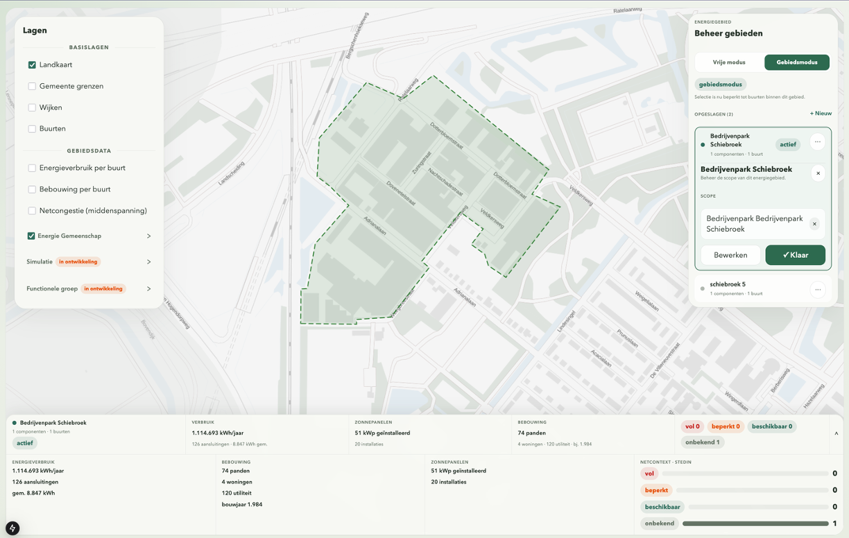Gebiedsinzicht combineert twee geïntegreerde onderdelen die samen beantwoorden wat elk bedrijventerrein zou moeten weten: wanneer zit ons terrein collectief vol — en bij welke kabels precies?